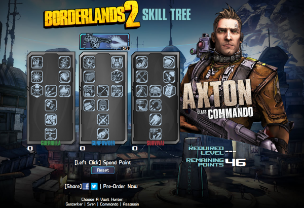 If you, like myself, are having trouble waiting for next week’s Borderlands 2 release to the point of being ill (I kid you not, I am currently fighting off a sinus infection), then you may find panacea in Gearbox’s Borderlands 2 Skill Tree Calculator, now available for public consumption at the following location: